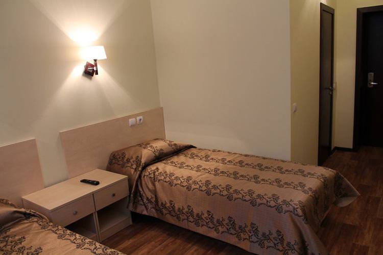Площадь номера - 13 кв.м кв.м. 1 осн. место. Мебель: вешалка, зеркало, кровати односпальные, прикроватные тумбочки, шкаф. Оборудование. Санузел: с душевой кабиной, туалетные принадлежности. Сервис: смена полотенец, смена постельного белья, уборка номера.