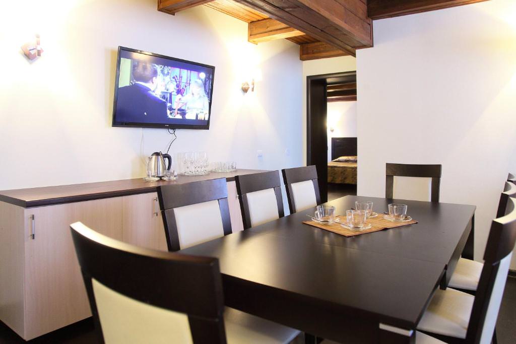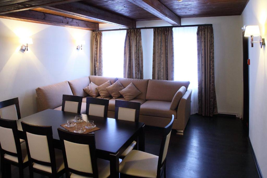 Площадь номера - 93 кв.м кв.м. 6 осн. мест. 2 доп. места. Мебель: вешалка, диван, зеркало, кровати односпальные /одна двуспальная кровать, кровать односпальная, прикроватные тумбочки, стол, стулья, шкаф. Мини-кухня. Оборудование: набор посуды, телевизор ЖК, холодильник, чайный набор посуды, электрочайник. Санузел: с душевой кабиной, туалетные принадлежности. Сервис: смена полотенец, смена постельного белья, уборка номера.